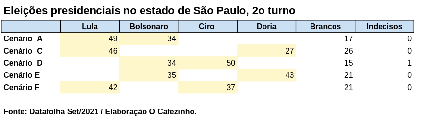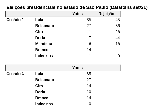O Datafolha divulgado hoje incluiu uma sondagem sobre os votos dos eleitores do estado de São Paulo.