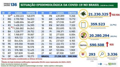 Já o total de pessoas infectadas pelo novo coronavírus desde o início da pandemia chegou a 21.230.325. Em 24 horas, foram confirmados pelas autoridades sanitárias 150.106 novos casos.