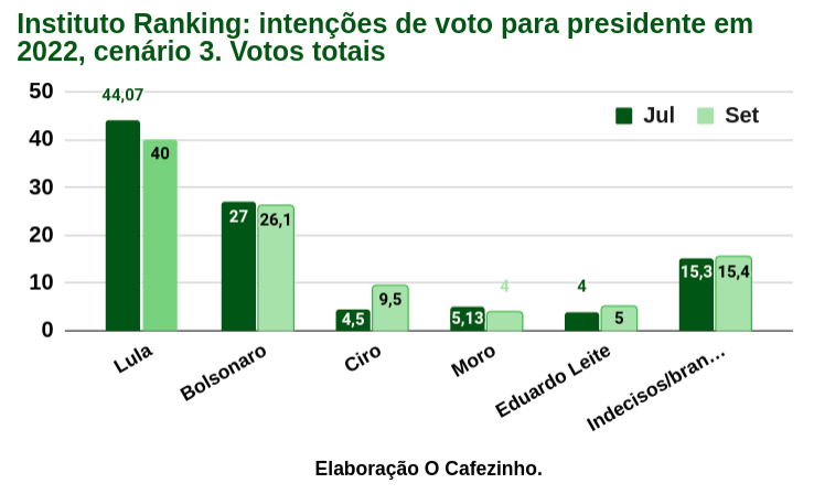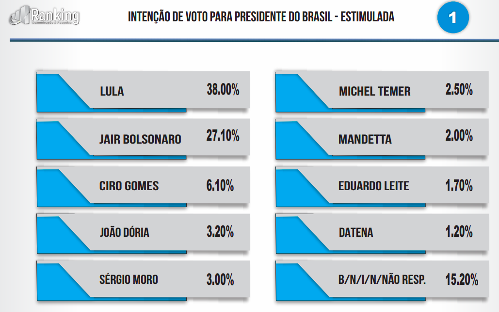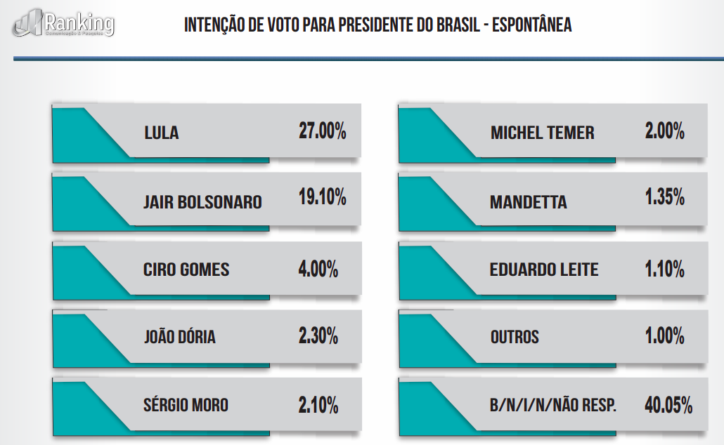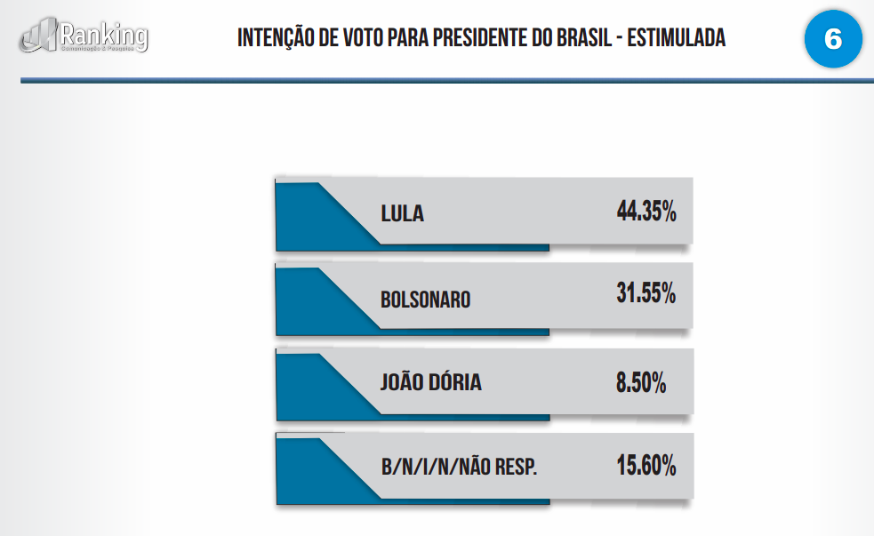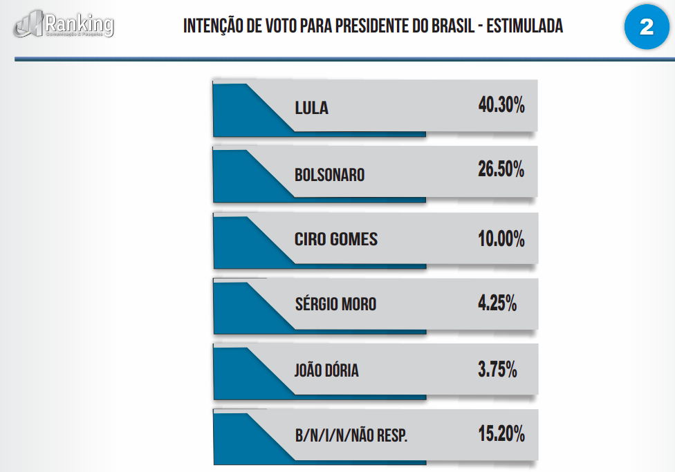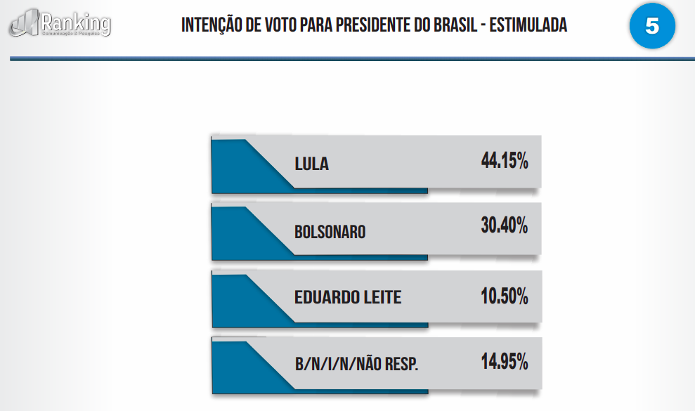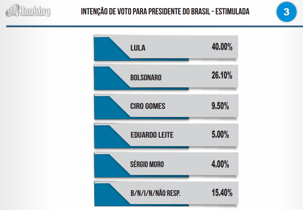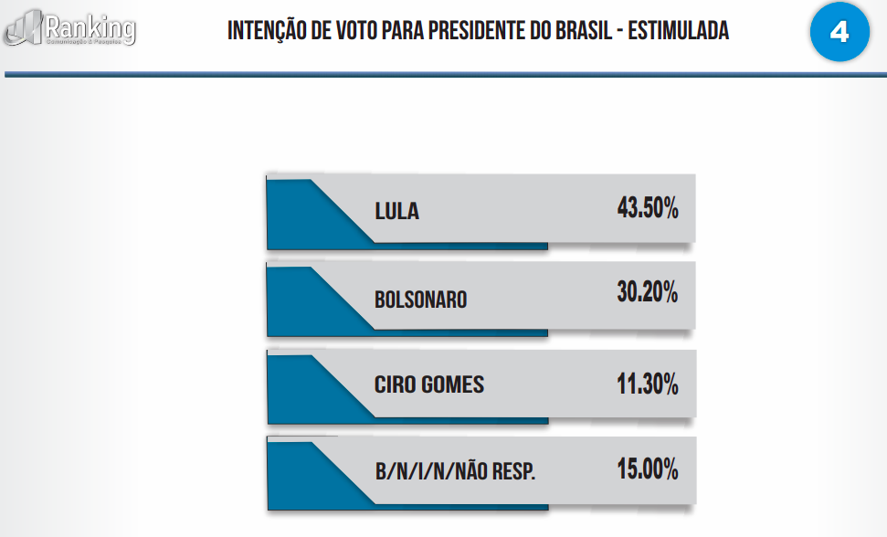 No cenário 3, com cinco candidatos, se detecta dois movimentos importantes: queda de 4 pontos de Lula, crescimento de 5 pontos de Ciro, e estagnação de outros candidatos. O desafio maior do pedetista, porém, é tirar Bolsonaro, que se mantém firme na segunda posição.