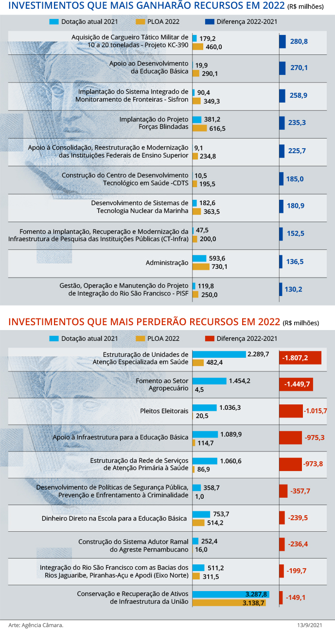 Já os investimentos de Saúde e Educação estão entre os que mais perderam recursos. A estruturação de Unidades de Atenção Especializada em Saúde passou de uma dotação de R$ 2,3 bilhões, neste ano, para R$ 482 milhões em 2022, uma diferença de R$ 1,8 bilhão. O Fomento ao Setor Agropecuário, atualmente com R$ 1,4 bilhão, tem apenas R$ 4,5 milhões no projeto de lei orçamentária para o ano que vem.