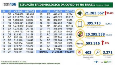 Já o total de pessoas que não resistiram à pandemia até o momento é de 592.316 pessoas. Entre ontem e hoje, foram confirmadas pelas autoridades de saúde 876 novas mortes. Ontem, a compilação de dados do Ministério da Saúde contabilizava 591.440 óbitos.