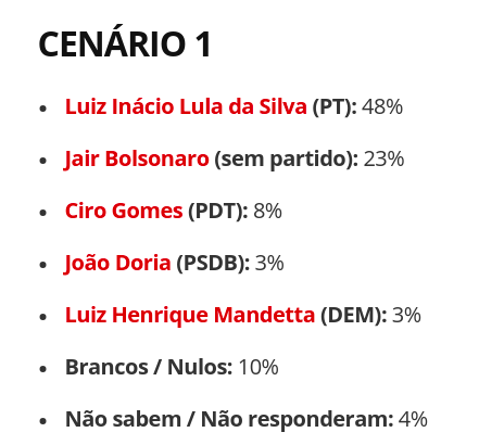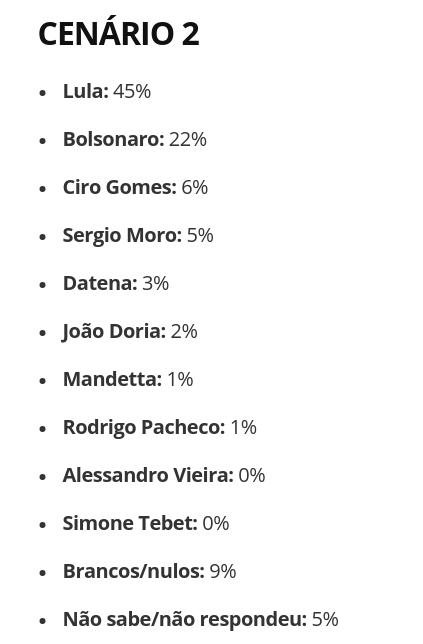 No cenário 2, expandido com mais candidatos, Lula teria 45% dos votos totais, e 53% dos votos válidos, o que igualmente lhe daria vitória no primeiro turno.
