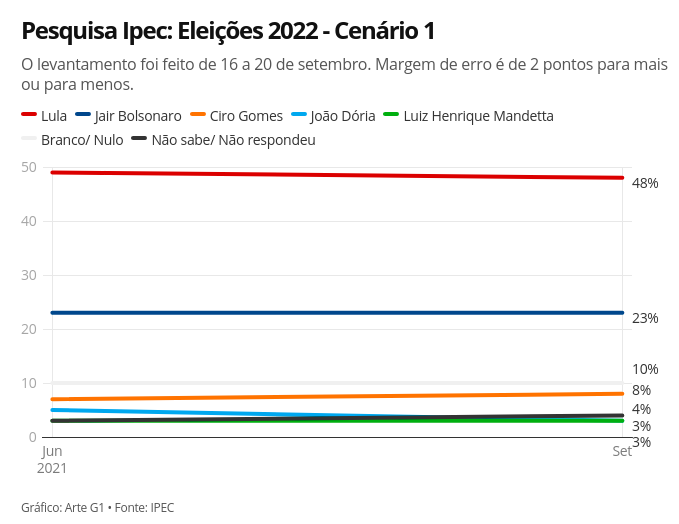 Em votos totais, Lula tem 48% e oscilou 1 ponto para baixo em relação à última pesquisa, de junho. Bolsonaro ficou parado em 23% dos votos totais.