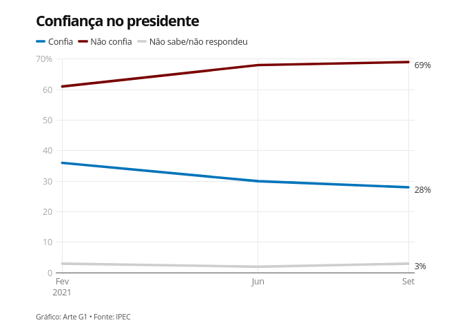 A pesquisa também fez a pergunta: “E o(a) senhor(a) confia ou não confia no presidente Jair Bolsonaro?” Os percentuais foram: