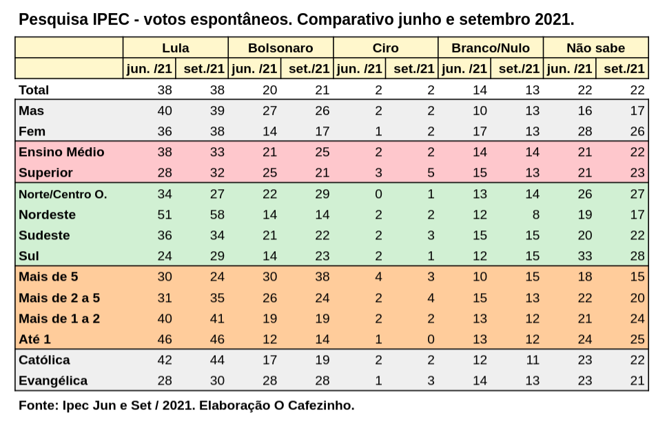 Na espontânea do Ipec, a votação de Lula entre eleitores com renda familiar até 1 salário é de 46%, contra 14% de Bolsonaro e 0% de Ciro.