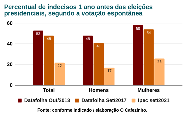 Em outubro de 2013, um ano antes das eleições de 2014, o total de indecisos, segundo o Datafolha, era de 53%. Em setembro de 2017, um ano antes do pleito de 2018, o número total de indecisos era de 48%.