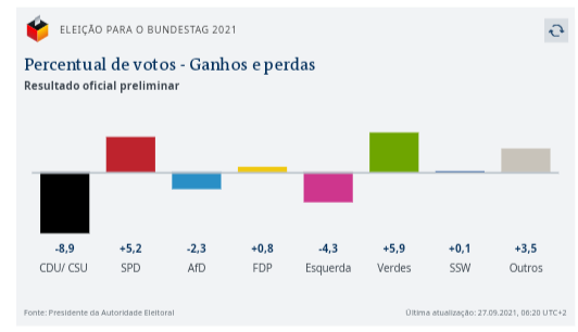 Ainda assim, os 24,1% conquistados pelo partido representam o pior resultado nacional da história da legenda conservadora e de seu braço bávaro, a União Social Cristã (CSU), fundadas em 1945, logo após a Segunda Guerra Mundial.