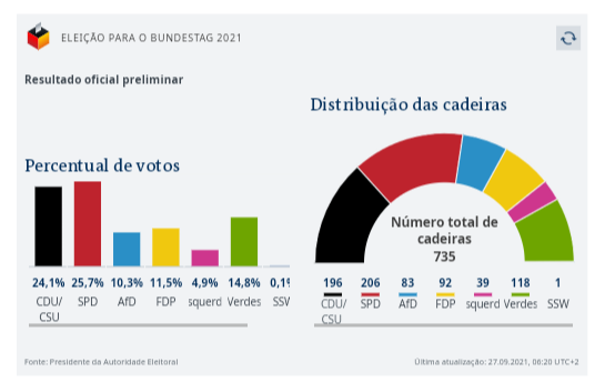 A conservadora União Democrata Cristã (CDU, centro-direita) recuperou terreno na reta final da eleição alemã, quase empatando com seu principal rival, o Partido Social-Democrata (SPD, social-democrata) na votação deste domingo (26/09), segundo o resultado oficial preliminar, que dá 25,7% dos votos para o SPD e 24,1% para a CDU.