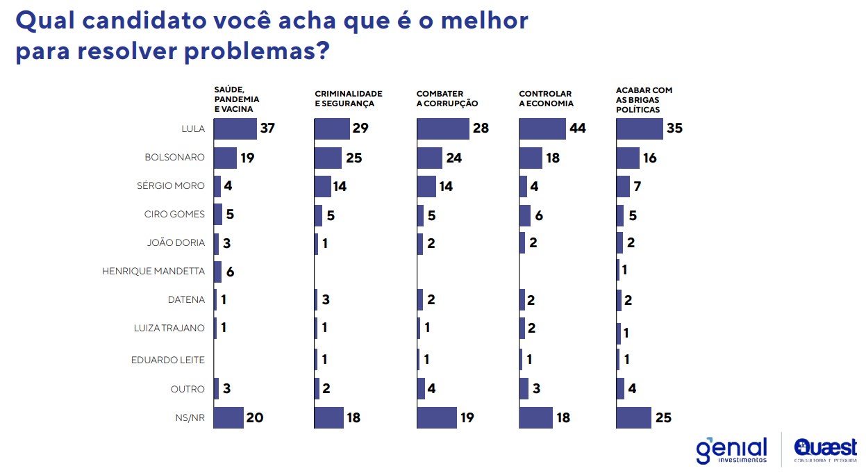 O gráfico acima prova que o candidato da terceira via com maior potencial de crescimento é Sergio Moro, porque ele ainda tem alguma imagem como alguém capaz de lidar com problemas de criminalidade e corrupção. Mesmo assim, está em terceiro lugar distante. Lula é visto como melhor nome para resolver os principais problemas, com destaque para controle da economia. Para 44% dos entrevistados, Lula é o melhor nome para lidar com os problemas econômicos, contra 18% de Bolsonaro e 6% de Ciro.