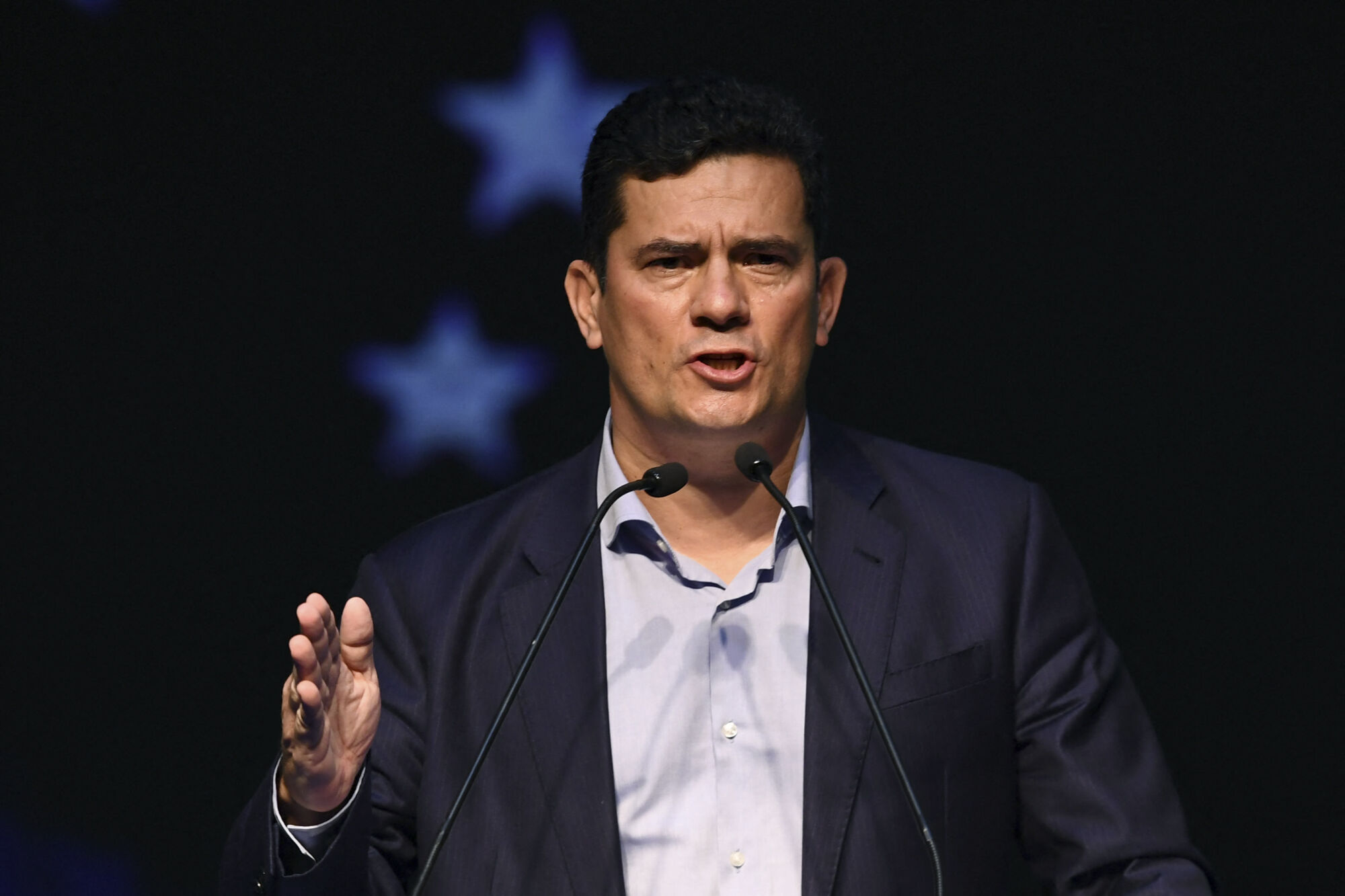 Former Brazilian judge and Justice Minister Sergio Moro speaks during an event to announce his affiliation to the PODEMOS party in Brasilia, on November 10, 2021. - Brazil's former judge Sergio Moro, an icon of the Lava Jato anti-corruption mega-operation that led to the imprisonment of former president Lula (2003-2010), joined a centrist party on Wednesday with a view to participating in the 2022 elections. (Photo by EVARISTO SA / AFP)