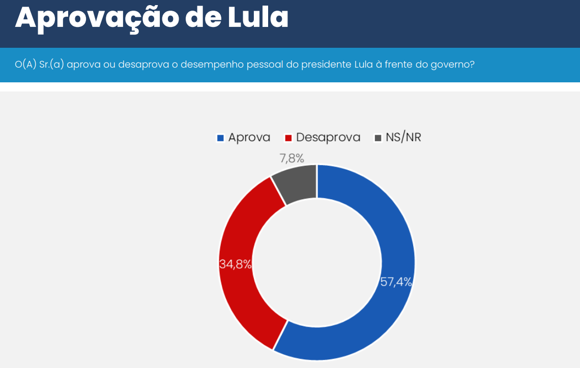 Lula conquista, portanto, no quinto mês de governo, a avaliação máxima de Bolsonaro, registrada no início do governo, em fevereiro de 2019. Na pesquisa seguinte, porém, em agosto de 2019, a aprovação pessoal de Bolsonaro despencaria para 41% e sua rejeição explodiria para 54%.