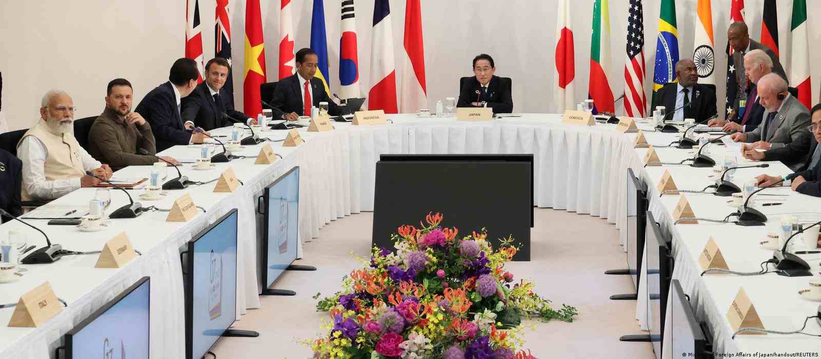 De um lado da mesa, Lula estava sentado entre o presidente dos EUA, Joe Biden, e o premiê do Canadá, Justin Trudeau. Do outro lado, Zelenski estava entre o primeiro-ministro indiano, Narendra Modi, e o presidente sul-coreano Yoon Suk-yeol.