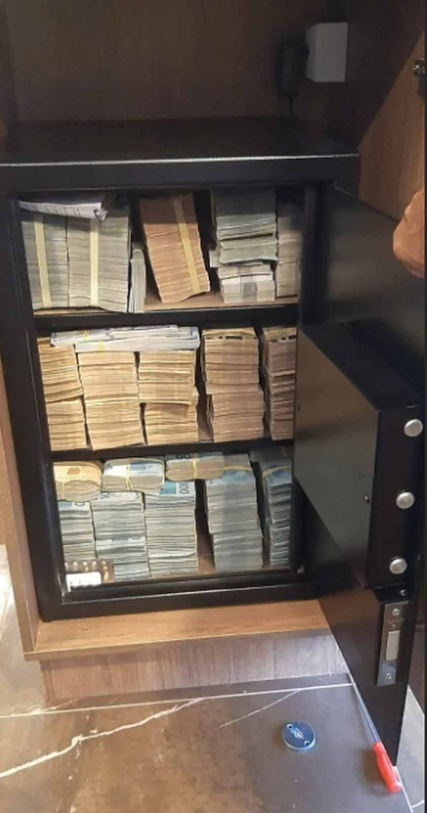 Os malotes de dinheiro foram descobertos enquanto os policiais federais estavam cumprindo um dos mandados de prisão temporária em Brasília. Imagens revelam maços de reais e dólares lotando três prateleiras do cofre.