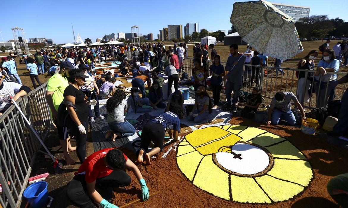 Segundo o Metrópoles, fiéis de várias partes do Distrito Federal se reuniram na Esplanada dos Ministérios pela manhã para comemorar o dia de Corpus Christi nesta quinta-feira (8). Desde antes das 7h, grupos compostos por jovens começaram a criar o tradicional tapete feito de areia, palha e serragem, decorado com símbolos católicos. De noite, esse tapete percorrerá pela procissão carregando o corpo e o sangue de Cristo.