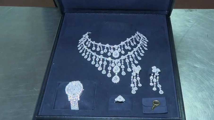 O conjunto, da marca Chopard, estava cuidadosamente acondicionado em uma caixa de couro revestida de veludo. Entre as peças, havia um colar de ouro branco com vários pingentes cravejados de diamantes. Além disso, um par de brincos, um anel e um relógio de pulso, todos confeccionados em ouro e pedras preciosas, também estavam presentes na caixa.