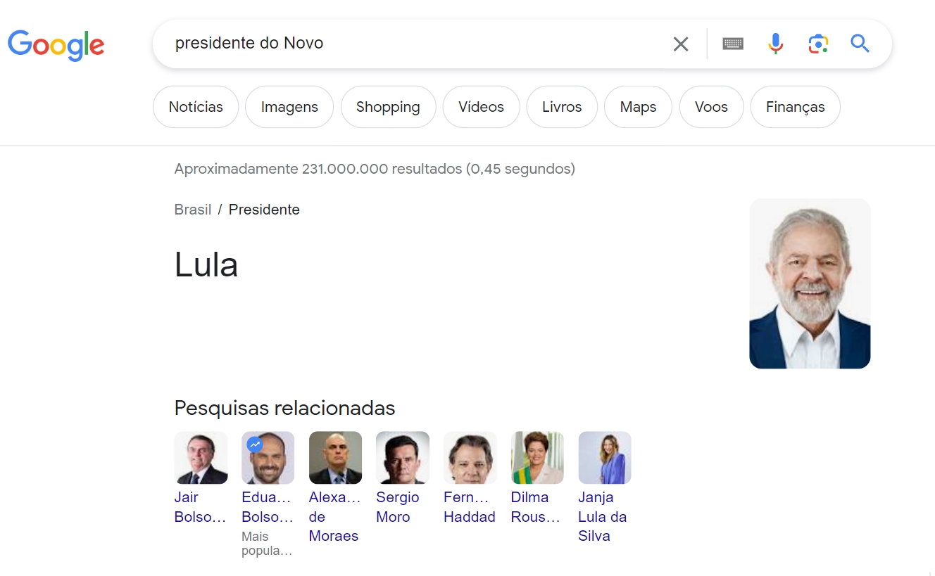Essa mesma situação se repete quando os usuários pesquisam “presidente do Novo” sem mencionar a palavra “partido”. Em ambas as sugestões, é exibida uma foto de Lula ao lado do seu nome. Além disso, a plataforma também sugere outros políticos não filiados ao Novo, como o ex-presidente Jair Bolsonaro e o ministro do STF Alexandre de Moraes.