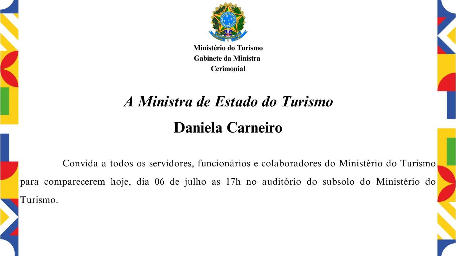 Os funcionários do Ministério do Turismo receberam hoje um convite da chefe da pasta Daniela Carneiro (UNIÂO-RJ) para um encontro hoje às 17 horas desta quinta-feira (06).