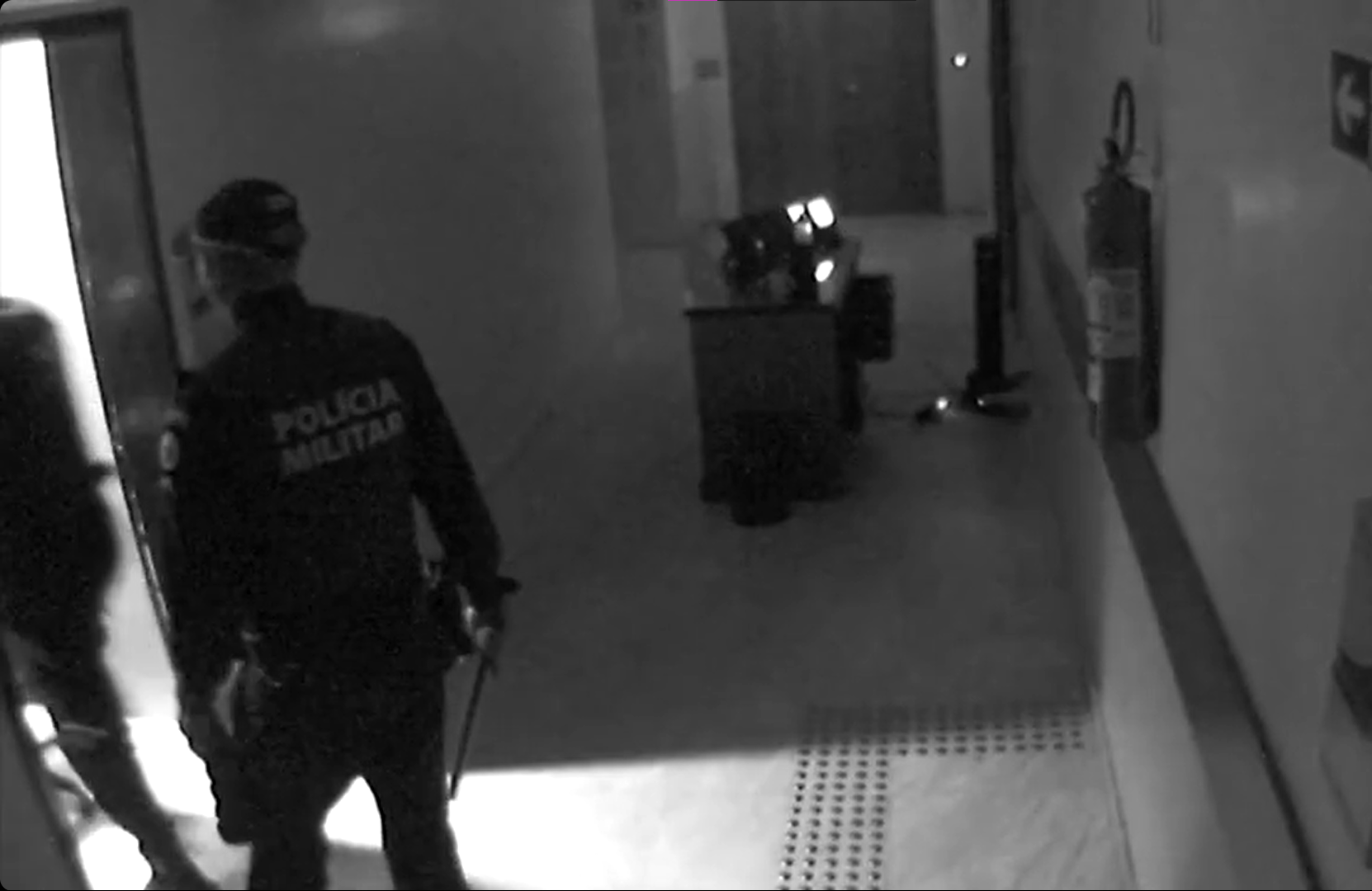 As cenas capturadas mostram um policial militar abrindo a porta do banheiro do terceiro andar, que já havia sido invadido, para verificar se não há invasores presentes. Logo em seguida, outros dois policiais militares entram, um deles aparentemente ferido e segurando a cabeça. Cerca de dez policiais permanecem no banheiro durante mais de dez minutos, movimentando-se intensamente.