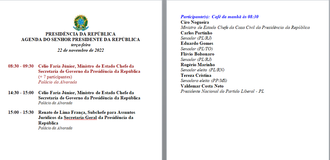 Com base nos e-mails do ex-ajudante de ordens do ex-presidente, Jair Bolsonaro (PL-RJ), que o site O Cafézinho obteve acesso, foi revelado que Bolsonaro conduziu uma série de reuniões no Palácio do Planalto um dia após o PL apresentar relatório golpista contra as urnas.