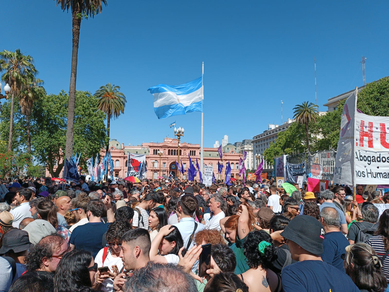 Com a presença de milhares de pessoas na praça em frente à Casa Rosada, sede do governo argentino, foi realizado na quinta-feira, 23/11, quatro dias após a eleição presidencial, o histórico ato das Madres de la Plaza de Mayo, que ocorre há 47 anos, com a presença de diversas organizações de direitos humanos, organizações sociais e de esquerda. Mais uma vez, manteve-se nas ruas a luta nas ruas pela Memória, Verdade e Justiça às portas de um novo governo com alto conteúdo pró ditadura. Uma nítida indicação que será firme a resistência às propostas predatórias e antidemocráticas de Milei, No dia seguinte, milhares de manifestantes também se mobilizaram do Congresso à Plaza de Mayo. A marcha foi convocada pela Campanha Nacional pelo Direito ao Aborto e por uma ampla gama de organizações feministas, sociais, sindicais, estudantis e políticas. “Contra o ajustamento e Milei”, “Eles não ignorarão os nossos direitos” e “Nenhum direito a menos, nenhum ajuste a mais” estavam nos cartazes e faixas.