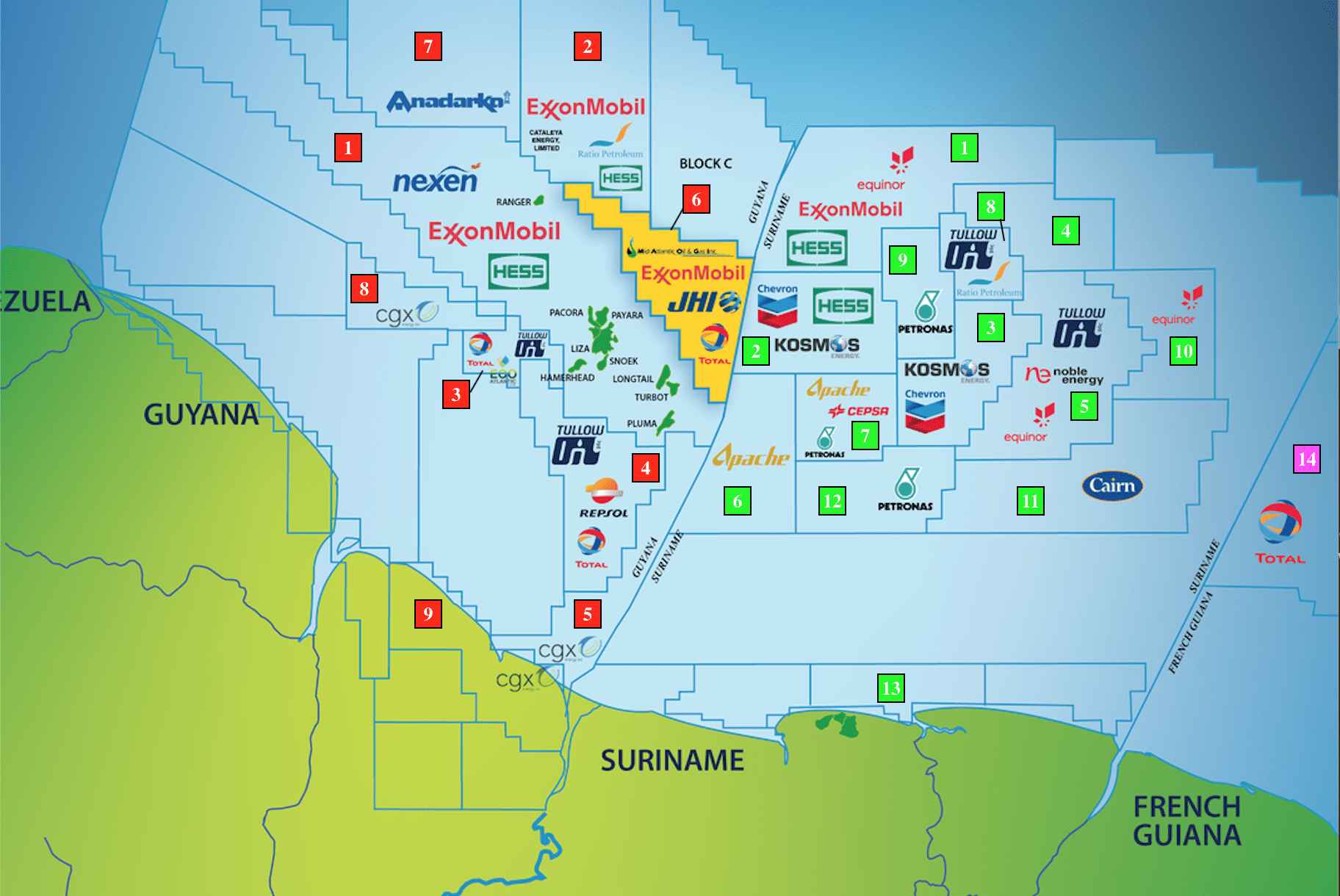 Nos anos seguintes, o consórcio composto pela Exxon Mobil, a também americana Hess e a chinesa CNOOC arrematou poços a pouco mais de 200 quilômetros da costa guianense.
