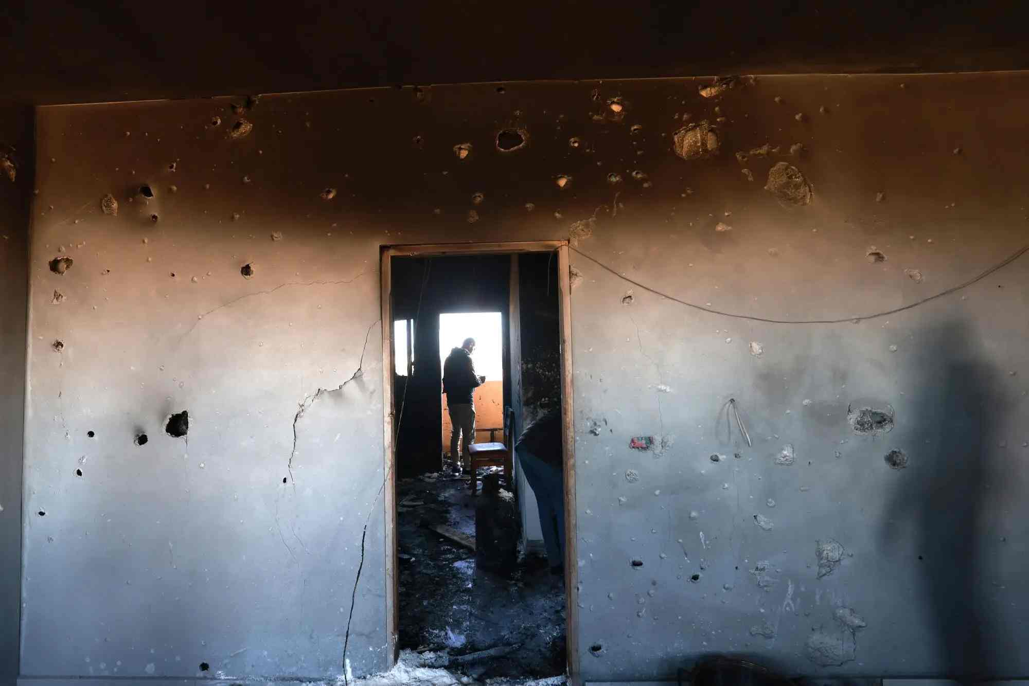 O corpo queimado e marcado dentro de um abrigo de MSF em Al Mawasi depois que um bombardeio israelense atingiu o prédio, matando duas pessoas e ferindo outras seis. Khan Younis, Gaza, Palestina, 21 de fevereiro de 2024. © MOHAMMED ABED