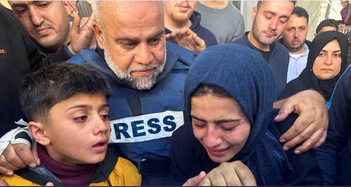 O jornalista palestino Wael Al-Dahdouh, de 53 anos, fazia uma transmissão ao vivo quando recebeu um telefonema informando que sua esposa, dois dos seus filhos, de 7 e 15 anos, e o neto, com poucos meses de vida, foram assassinados em um bombardeio israelense, no dia 25 de outubro de 2023.