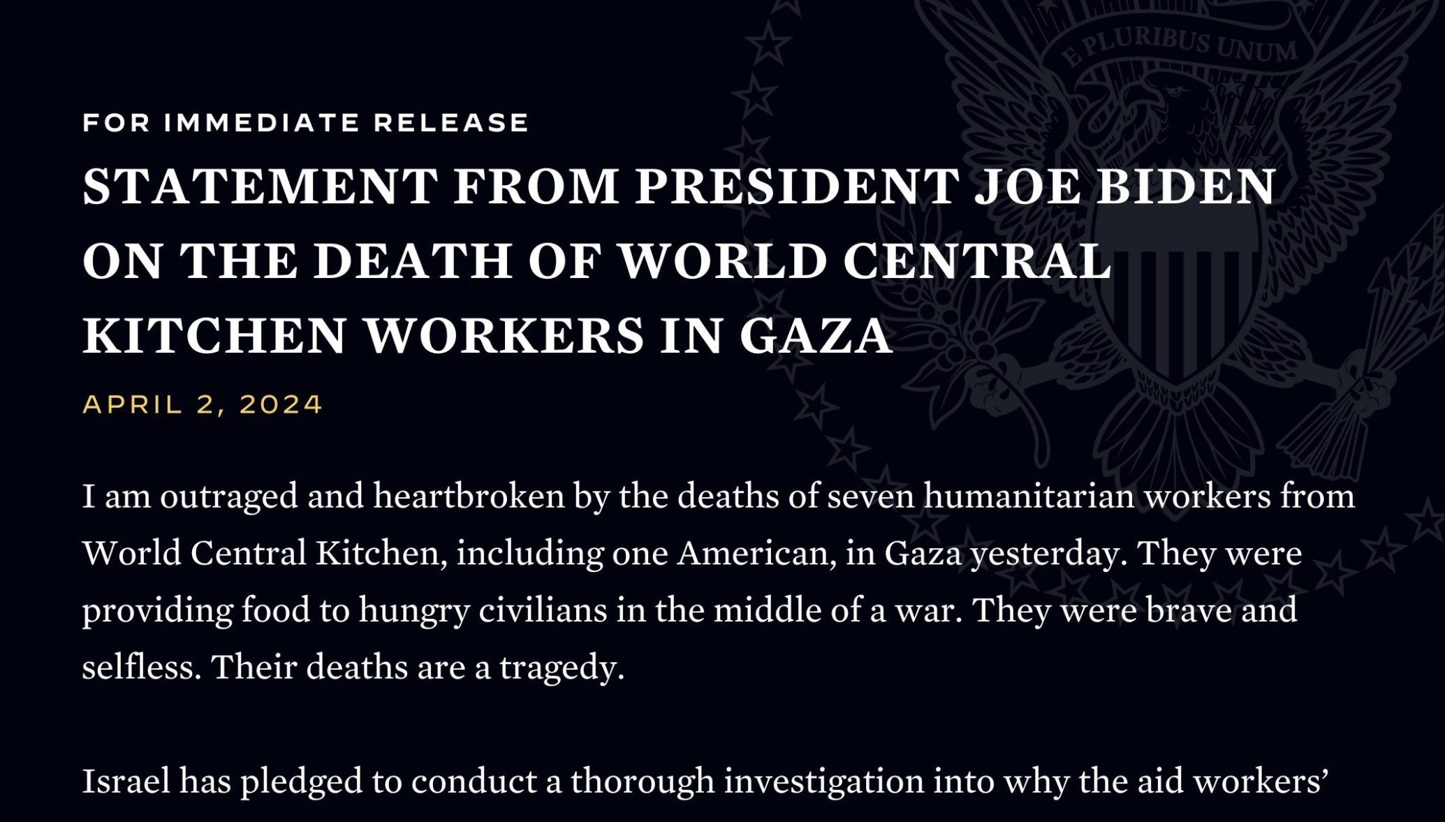 A nota oficial do presidente, emitida em 2 de abril de 2024, expressa indignação e consternação com a morte de sete trabalhadores humanitários da ONG World Central Kitchen em Gaza, incluindo um cidadão americano. Eles estavam fornecendo alimentos para civis famintos em meio a um conflito armado.