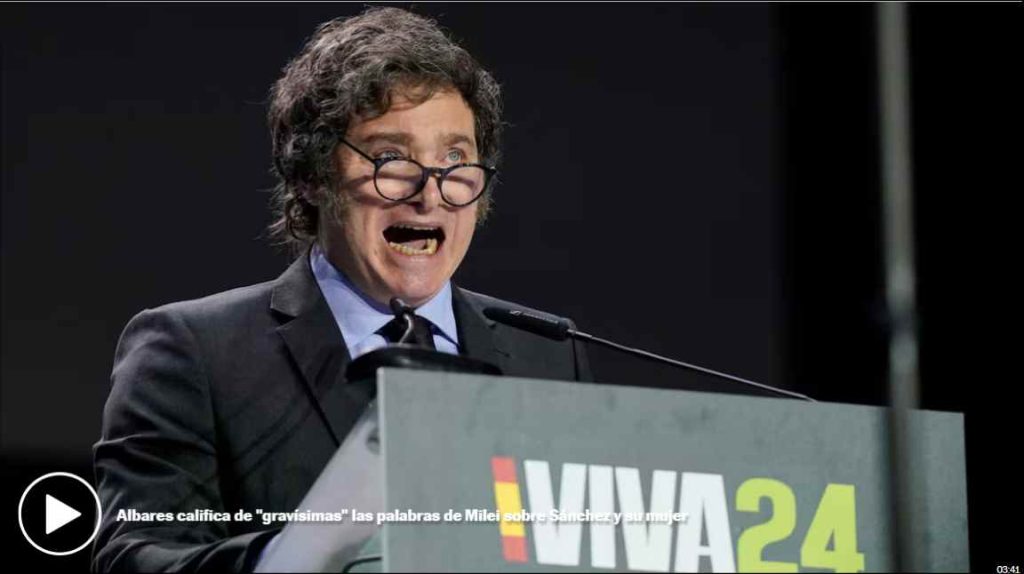 No evento do Vox, Milei atacou pessoalmente Pedro Sánchez, sem citá-lo, e sua esposa, Begoña Gómez, a quem chamou de “corrupta”. A convenção internacional da ultradireita foi realizada no Palácio de Vistalegre, no bairro madrilenho de Carabanchel, e entre muitos outros, participaram a líder da Reunião Nacional francesa, Marine Le Pen, e a primeira-ministra italiana, Giulia Meloni, que interveio por videoconferência. “Não sabem que tipo de sociedade e país pode produzir o socialismo e que laia de gente atornilhada no poder e que níveis de abuso pode gerar. Mesmo que tenha a mulher corrupta, suja-se e leva cinco dias para pensar”, disse Milei, aludindo ao período de reflexão que o chefe do governo levou para decidir se continuava no cargo após as denúncias contra sua esposa. Santiago Abascal e os demais participantes do comício levantaram-se para ovacioná-lo.