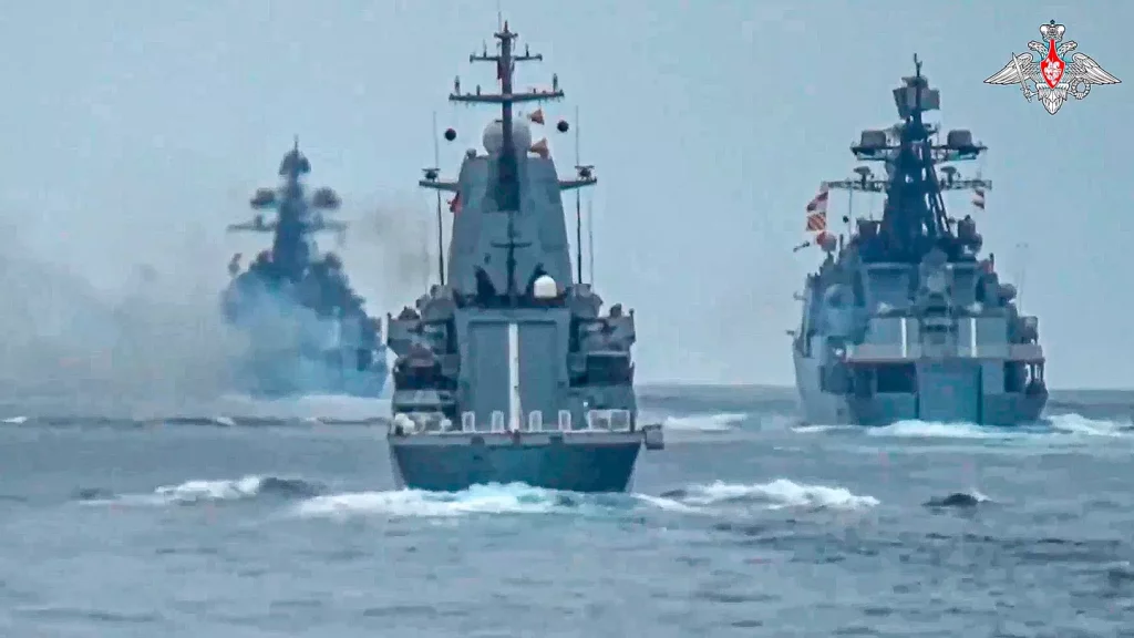 A fragata Almirante Gorchkov, conhecida por operar mísseis hipersônicos, e o submarino Kazan, são acompanhados por um navio-tanque e um rebocador.