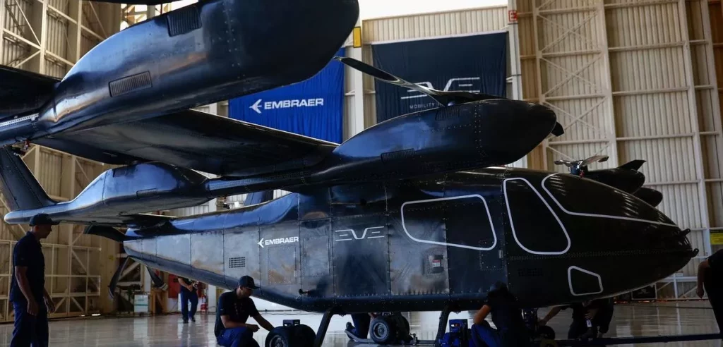A Eve, subsidiária da Embraer, revelou o primeiro protótipo em escala real de sua aeronave elétrica de decolagem e pouso verticais (eVTOL) durante um evento para investidores e clientes na instalação industrial de Gavião Peixoto, em São Paulo, no dia 3 de julho.