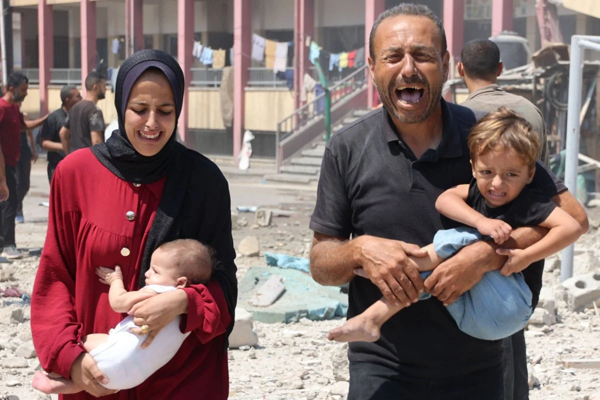 A escola foi completamente destruída, e dezenas de homens e mulheres palestinos, muitos segurando crianças, foram vistos fugindo do local após o ataque.