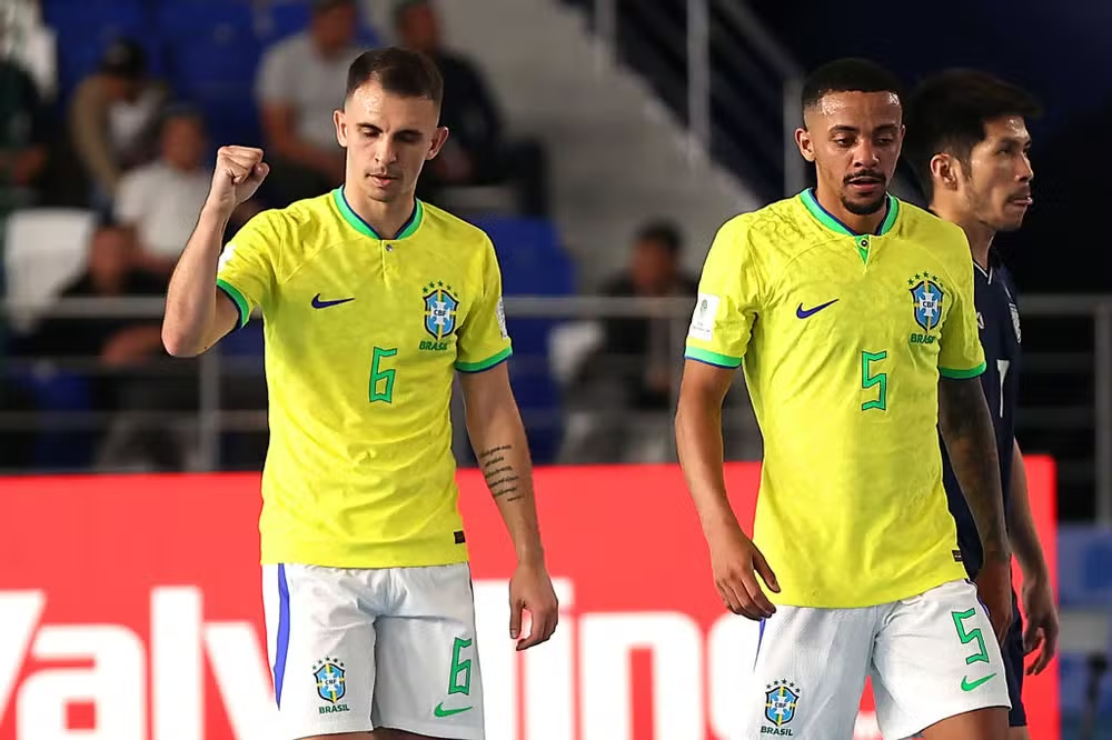 O Brasil derrotou a Tailândia nesta sexta-feira (20) e garantiu a liderança do grupo B da Copa do Mundo de Futsal, disputada no Uzbequistão. No Complexo Esportivo de Bukhara, a Seleção Brasileira venceu por 9 a 1. Os gols foram marcados por Marcel (três vezes), Felipe, Pito (duas vezes), Marlon, Kritsada Wongkaeo (contra) e Ferrão. A Tailândia descontou com Muhammad Osamanmusa.