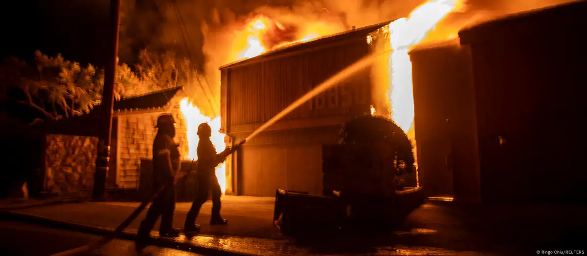 Com diversos incêndios florestais à sua volta, a cidade de Los Angeles, Califórnia, é o mais recente na série crescente de centros urbanos ameaçados de destruição pelas chamas descontroladas, à medida que as temperaturas globais sobem. Alimentados por ventos fortes, os incêndios se alastraram por áreas densamente povoadas, causando pelo menos cinco mortes e destruindo milhares de edifícios.