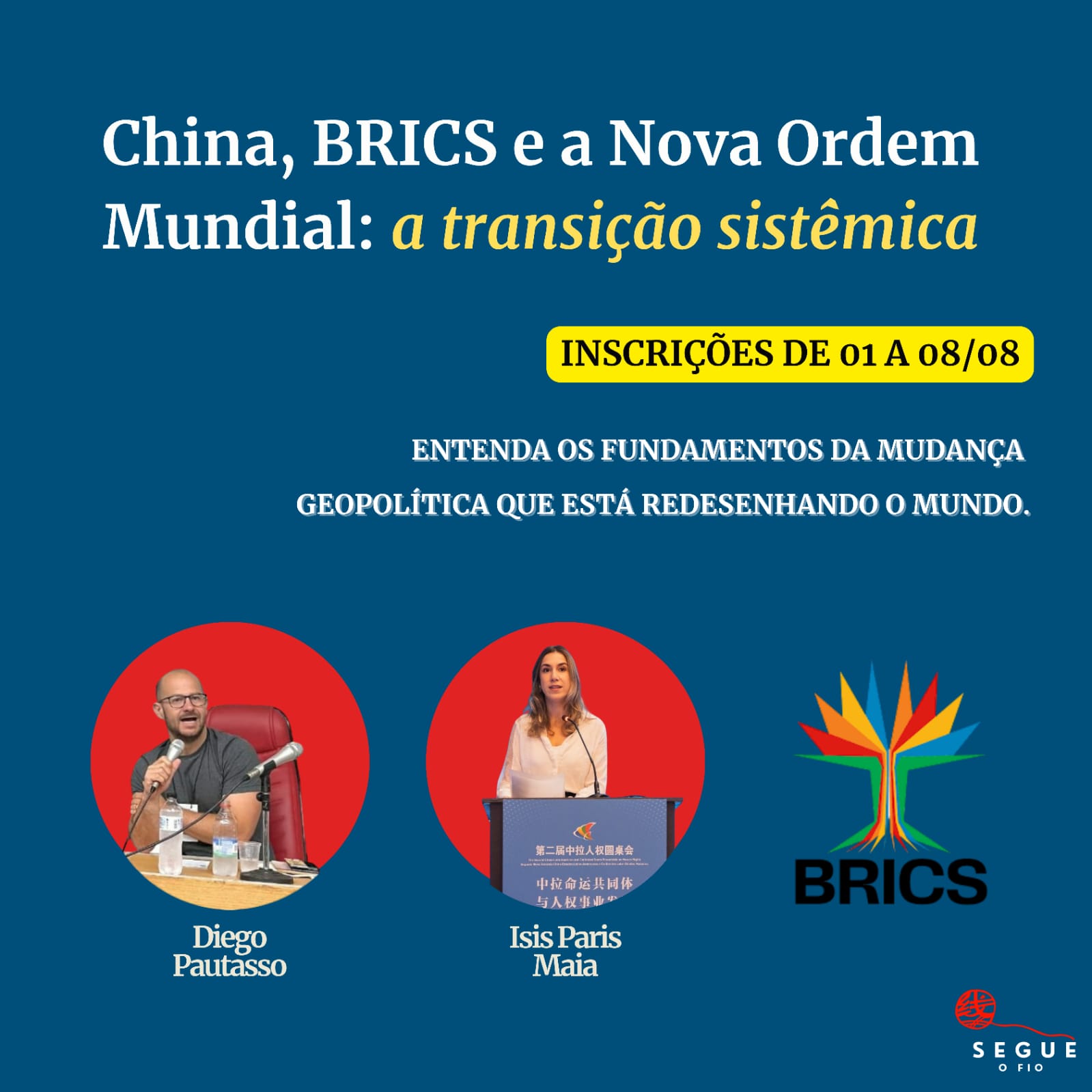 O projeto Fios de China lança um novo curso online que promete aprofundar o debate sobre as transformações da ordem mundial a partir da ascensão da China e da atuação dos BRICS. Intitulado China, BRICS e a nova ordem mundial: transição sistêmica, o curso é ministrado pelos pesquisadores Diego Pautasso e Isis Paris Maia, que integram o Fios de China e atuam em instituições acadêmicas brasileiras.