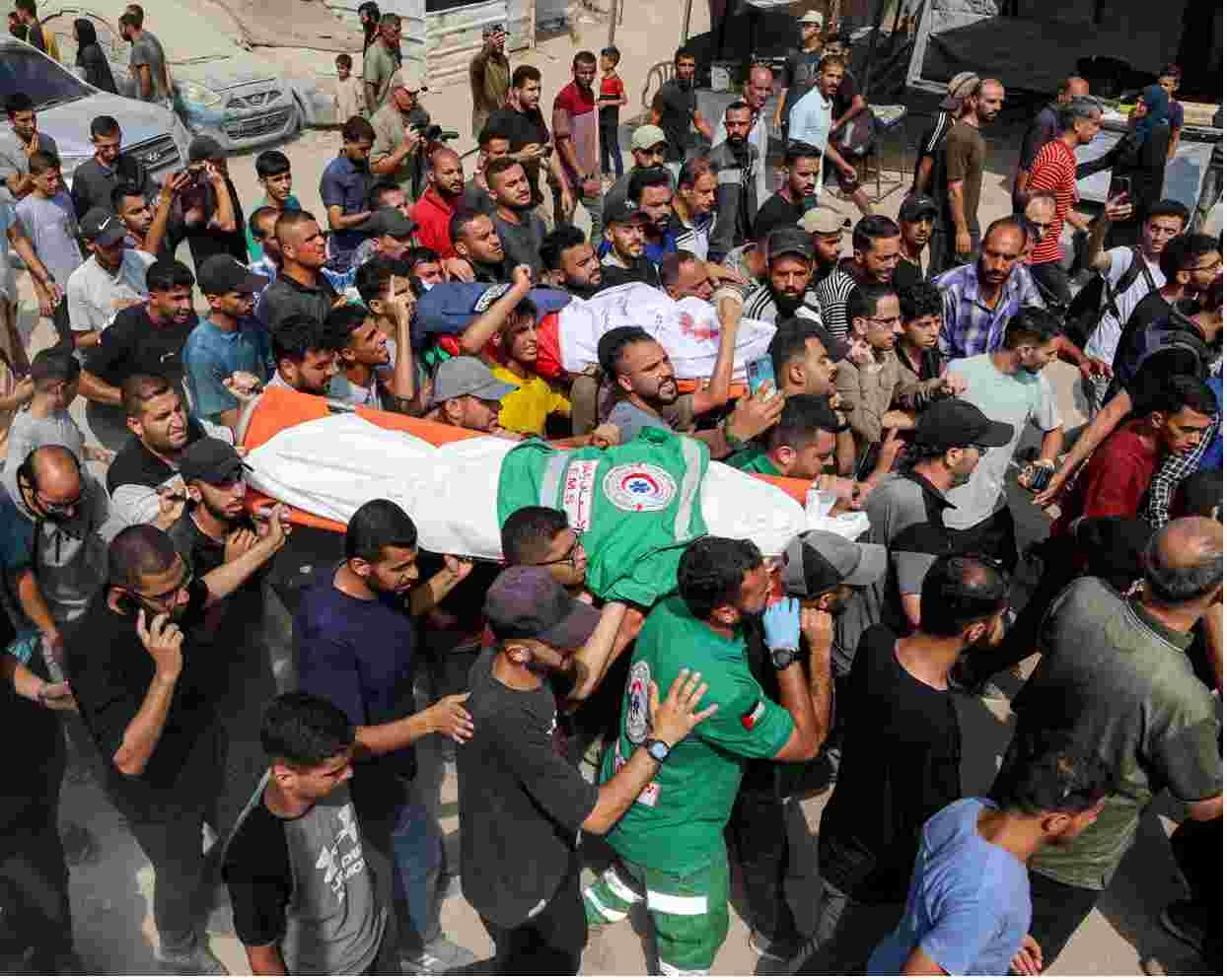 Pessoas se reuniram no cemitério Sheikh Radwan, no coração da Faixa de Gaza, para lamentar os jornalistas, cujos corpos jaziam envoltos em lençóis brancos no hospital al-Shifa antes do enterro. Amigos, colegas e parentes se abraçaram e consolaram.