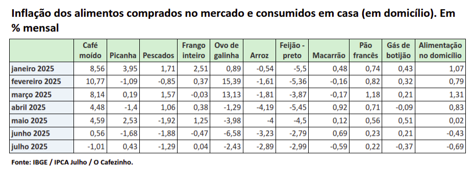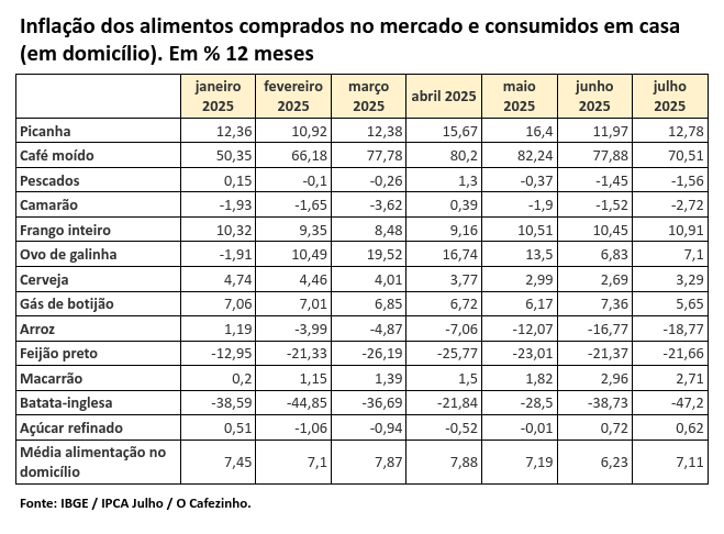 Até mesmo os vilões tradicionais da inflação alimentar cederam terreno no mês de julho. O café moído, que acumula alta de 70,51% em 12 meses, registrou pela primeira vez em muitos meses uma queda de 1,01%. A picanha manteve a trajetória descendente pelo segundo mês consecutivo com variação de 0,43%.