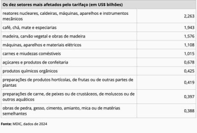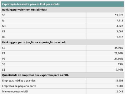 Tatiana afirmou que serão prejudicadas muitas empresas brasileiras que se estabeleceram, principalmente no Sul do país, apenas para exportar produtos que atendem especificidades do mercado americano. São Paulo é o estado mais afetado por exportar mais. O Ceará é o que mais destina produtos para os Estados Unidos em relação ao total exportado – quase 45%. Em seguida, vêm o Espírito Santo e a Paraíba (veja tabela abaixo).