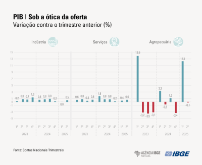 O Produto Interno Bruto (PIB) do país variou 0,4% no segundo trimestre de 2025, em relação ao trimestre anterior, e totalizou R$ 3,2 trilhões em valores correntes. Pela ótica da oferta, as altas dos setores de Serviços (0,6%) e da Indústria (0,5%) compensaram a variação negativa da Agropecuária (-0,1%). Pelo lado da oferta, o Consumo das Famílias cresceu 0,5%, enquanto o Consumo do Governo caiu 0,6%, e Investimentos recuaram 2,2%.