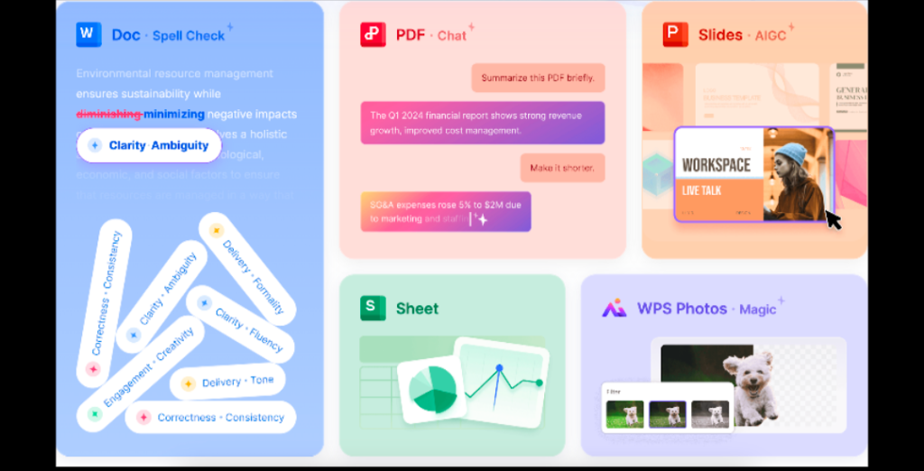 Outro ponto forte são os modelos de apresentação de slides. O WPS oferece apresentações de alto impacto para ambientes corporativos e de ensino. Elas são acompanhadas de esquemas de cores bem equilibrados, tipografia clara e organização ideal dos slides. Você pode até ter um layout pré-formatado que atenda às necessidades do seu público, seja para um relatório financeiro ou para uma aula.