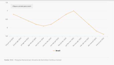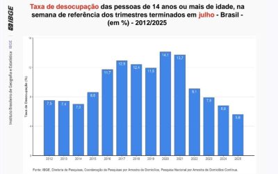 A taxa de desocupação do trimestre móvel encerrado em julho de 2025 caiu para 5,6%. Foi a menor taxa da série histórica deste indicador, que teve início em 2012. Os dados são da Pesquisa Nacional por Amostra de Domicílios (Pnad) Contínua, divulgada hoje (16) pelo IBGE.