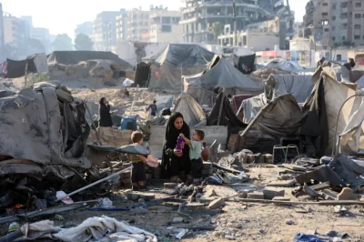 Uma mulher palestina deslocada senta-se com crianças em meio a tendas devastadas, após um ataque israelense durante a noite que arrasou um prédio e danificou os abrigos temporários ao redor | Omar Al-Qatta/AFP