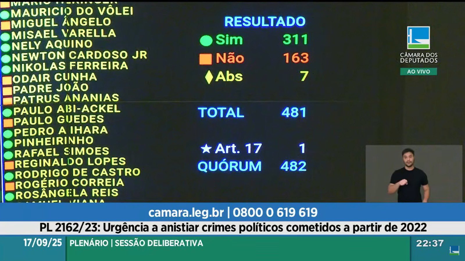 A votação da urgência dividiu o Plenário. Deputados da oposição e de partidos de direita defenderam a medida como forma de pacificação. O líder do Novo, Marcel van Hattem (RS), alegou que a proposta corrige injustiças e resgata o convívio familiar de pessoas simples. O deputado Gustavo Gayer (PL-GO) disse que o momento pode marcar a história do país após dois anos de luta.