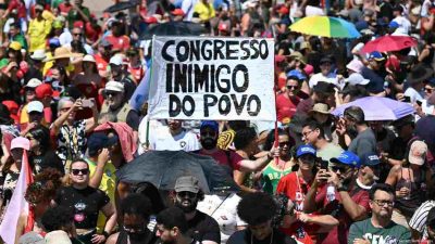 Alguns vestiam camisas vermelhas do PT, enquanto outros estavam enrolados na bandeira brasileira, que havia se tornado, nos últimos anos, emblema dos apoiantes da extrema direita de Jair Bolsonaro, recentemente condenado a 27 anos e três meses de prisão por tentativa de golpe de Estado. Faixas chamavam a proposta de blindagem de “PEC da Bandidagem”