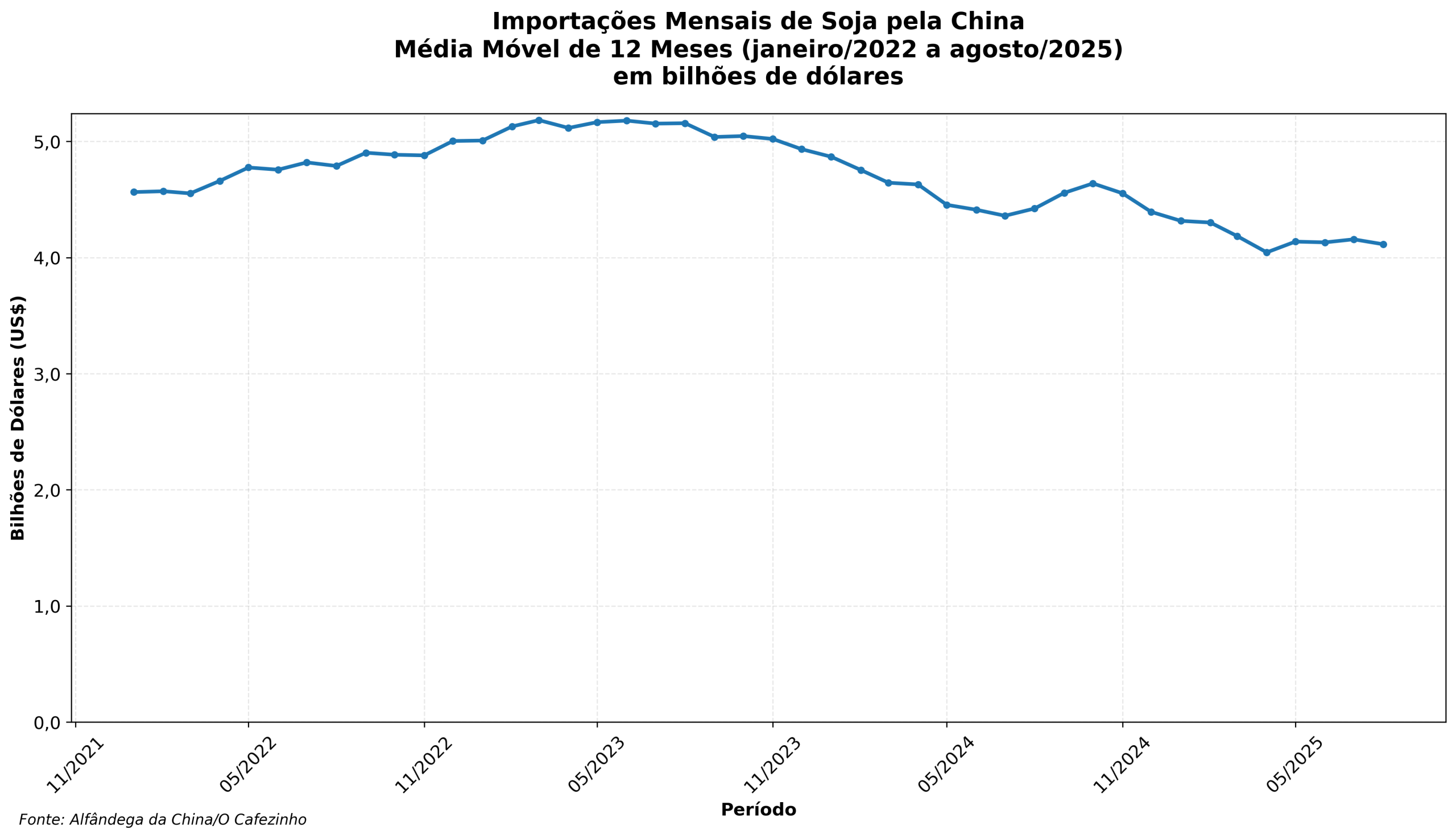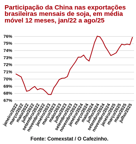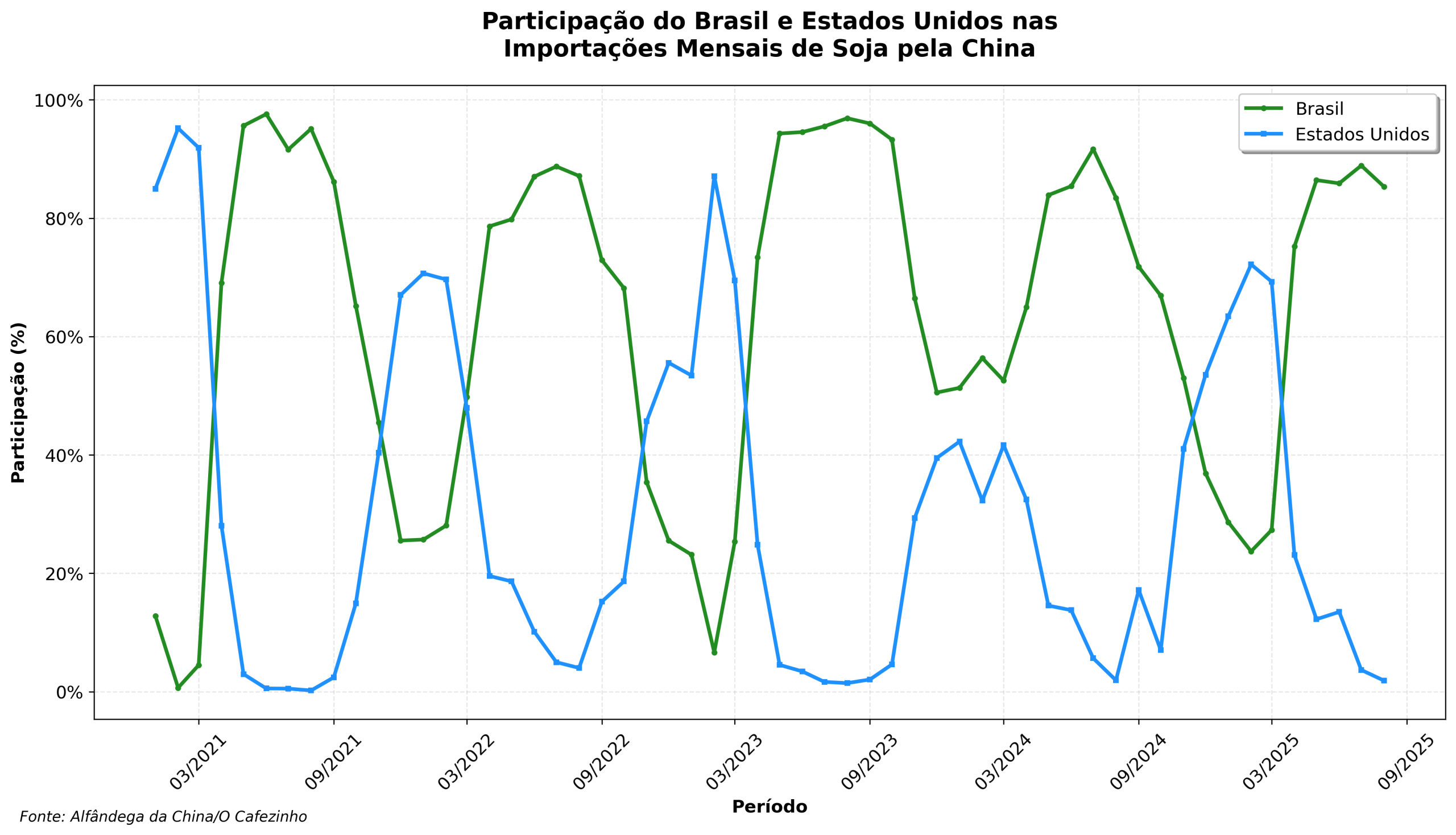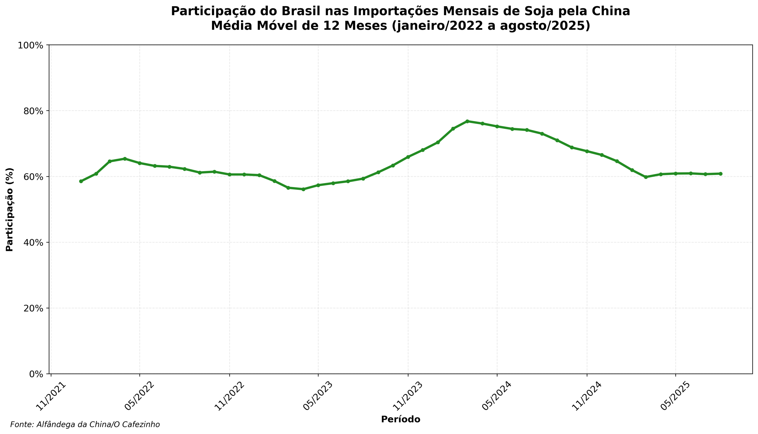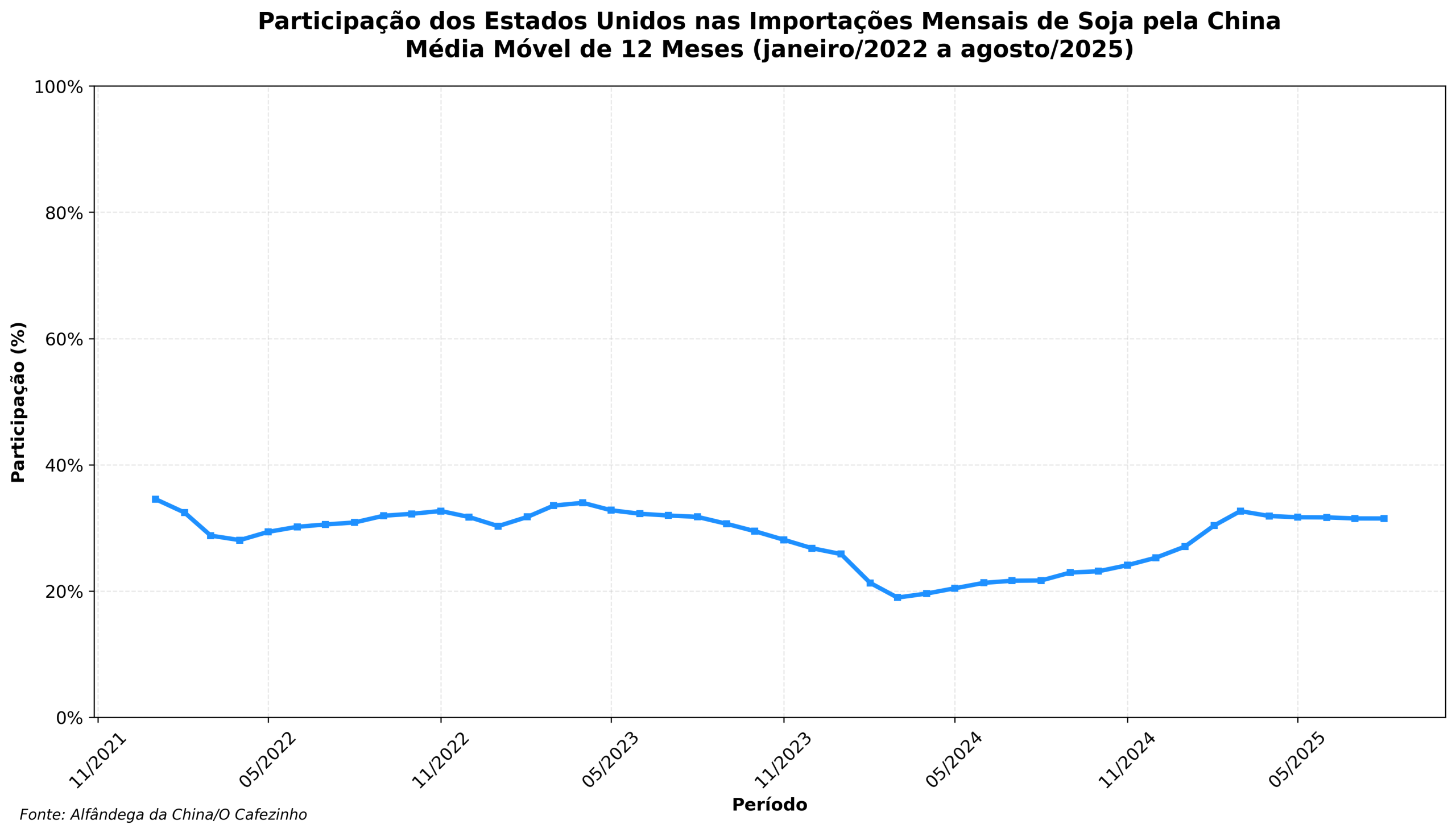 Essa volatilidade contrasta fortemente com a estabilidade brasileira. A participação da China nas exportações brasileiras de soja (média móvel de 12 meses) mantém-se consistentemente alta, variando entre 68% e 83% ao longo dos últimos anos. Em agosto de 2025, a China representava 76% das exportações brasileiras de soja, demonstrando a solidez dessa parceria comercial.