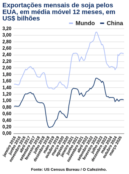 Os Estados Unidos, embora tenham exportações totais de soja menores (média móvel mensal de 12 meses), também cresceram no período, passando de US$ 1,50 bilhões em janeiro de 2016 para US$ 3,10 bilhões no pico de março de 2023. No entanto, as exportações americanas de soja para a China (média móvel mensal de 12 meses) mostram extrema volatilidade: colapsaram de US$ 0,94 bilhões em agosto de 2018 para apenas US$ 0,19 bilhões em janeiro de 2019 durante a guerra comercial iniciada por Trump, recuperaram-se para US$ 1,69 bilhões em fevereiro de 2023, e agora estagnaram em torno de US$ 1,03 bilhões em julho de 2025.
