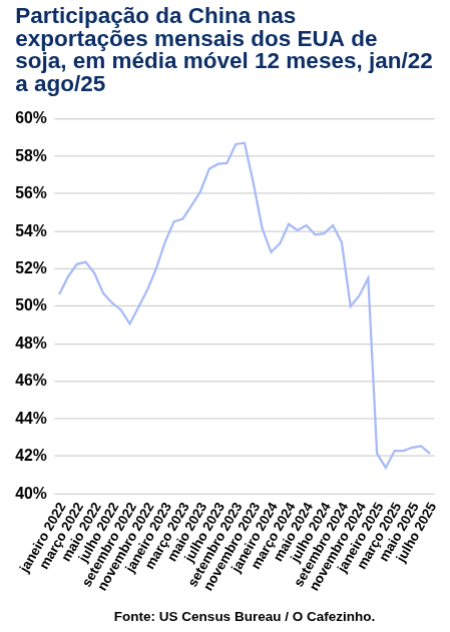 Para os Estados Unidos, a China representa um mercado crucial, mas também extremamente volátil. A participação da China nas exportações totais de soja americanas (média móvel de 12 meses) oscilou dramaticamente nos últimos anos: de um pico de 62% em dezembro de 2016, despencou para apenas 14% em janeiro de 2019 durante a guerra comercial iniciada por Trump em 2018, recuperou-se parcialmente para 59% em outubro de 2023, e agora volta a cair, atingindo 42% em julho de 2025.