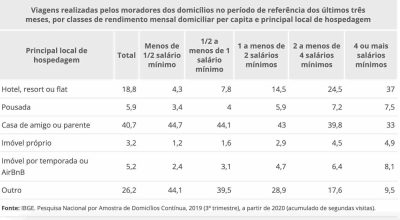 Os imóveis por temporada, inclusive aqueles por aplicativo de Internet, alcançaram 5,2% das viagens. Já as pousadas foram utilizadas em 5,9% das viagens. Apenas em 3,2% das viagens a hospedagem aconteceu em imóvel próprio.