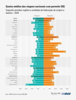 Entre as regiões, os destinos que registraram os maiores gastos médios com viagens foram Nordeste (R$ 2.523), Sul (R$ 1.943) e Centro-Oeste (R$ 1.704), seguidas pelas regiões Sudeste (R$ 1.684) e Norte (R$ 1.263). Quanto à origem, os maiores gastos estavam entre viagens saindo da Região Centro-Oeste (R$ 2.182), Sudeste (R$ 2.128) e Sul (R$ 1.787), seguidas por Norte (R$ 1.451) e Nordeste (R$ 1.206).