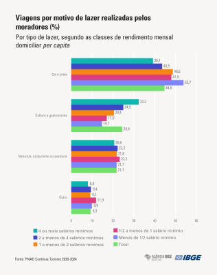 A principal finalidade das viagens de lazer em 2024 foram os destinos de sol e praia, com 44,6%. Esta é a proporção mais baixa da série: em 2023, eram 46,2% e, em 2020, 55,5%. Ainda assim, foram a preferência em todas as classes de rendimento, alcançando a maioria de todas as viagens daqueles com renda de até meio salário mínimo, com 53,7%. Esse percentual diminuiu conforme o nível de rendimento aumentou, reduzindo para 39,1% das viagens daqueles que tinham 4 ou mais salários mínimos de rendimento domiciliar per capita.